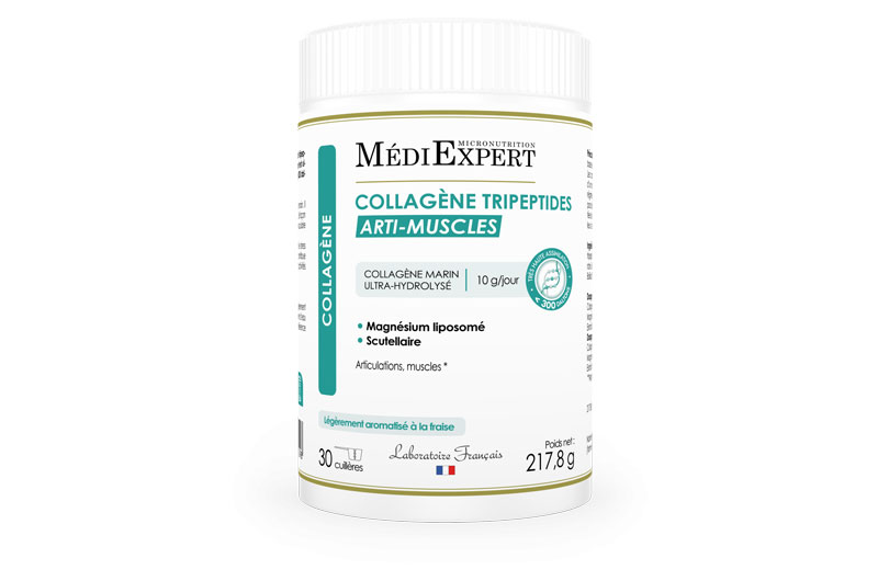 Médiexpert Collagène Tripeptides Arti-Muscles est un complément alimentaire formulé pour soutenir la santé articulaire et la fonction musculaire. Il associe du collagène marin ultra-hydrolysé (concentré en tripeptides) à du magnésium liposomé et un extrait de scutellaire. Il est conseillé aux personnes souhaitant préserver leur mobilité, soutenir leur tonus musculaire ou accompagner leurs performances sportives. Il peut être utilisé par : les adultes actifs, sportifs ou en reprise d’activité physique ; les personnes ressentant un inconfort articulaire ou musculaire lié à l’âge, à l’effort ou à une sollicitation répétée ; toute personne souhaitant soutenir durablement ses articulations et ses muscles, notamment en cas d’inconforts, de raideurs ou de récupérations difficiles. Naturellement sans gluten, sucres ou lactose. Sans conservateurs (forme déshydratée) ni colorants. Légèrement aromatisé à la fraise.