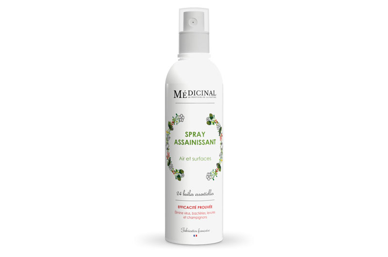 Médicinal Spray Assainissant possède une formule purifiante et désinfectante associant 24 huiles essentielles BIO reconnues pour leurs propriétés purifiantes. Il laisse une odeur fraiche et agréable grâce aux notes d’eucalyptus, de citron vert et de menthe. Il assainit l’air des pièces de vie et permet d’éliminer virus, bactéries, levures et champignons.