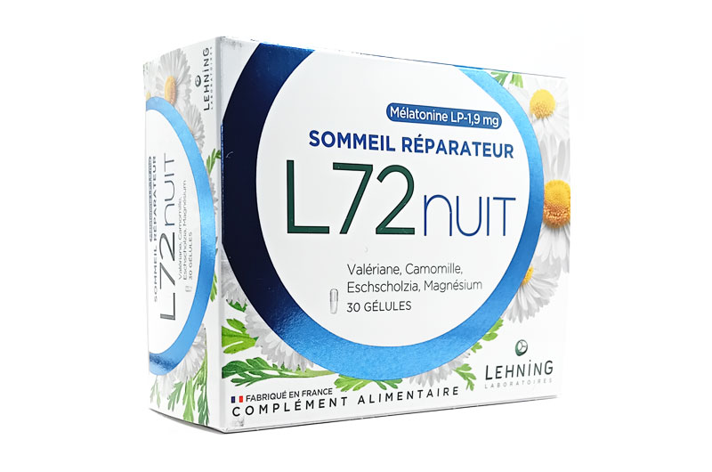 L72NUIT est un complément alimentaire en gélules à base de 3 plantes, magnésium et mélatonine à libération prolongée pour vous aider à retrouver un sommeil réparateur et vous réveiller en pleine forme le lendemain : La valériane aide à maintenir un sommeil naturel. La camomille contribue à la relaxation. L’eschscholtzia (pavot de Californie) améliore la qualité normale du sommeil. Le magnésium contribue au fonctionnement normal du système nerveux. La mélatonine (1,9 mg) contribue à réduire le temps d’endormissement. Une libération prolongée vous aide à bénéficier d’un sommeil réparateur tout au long de la nuit.